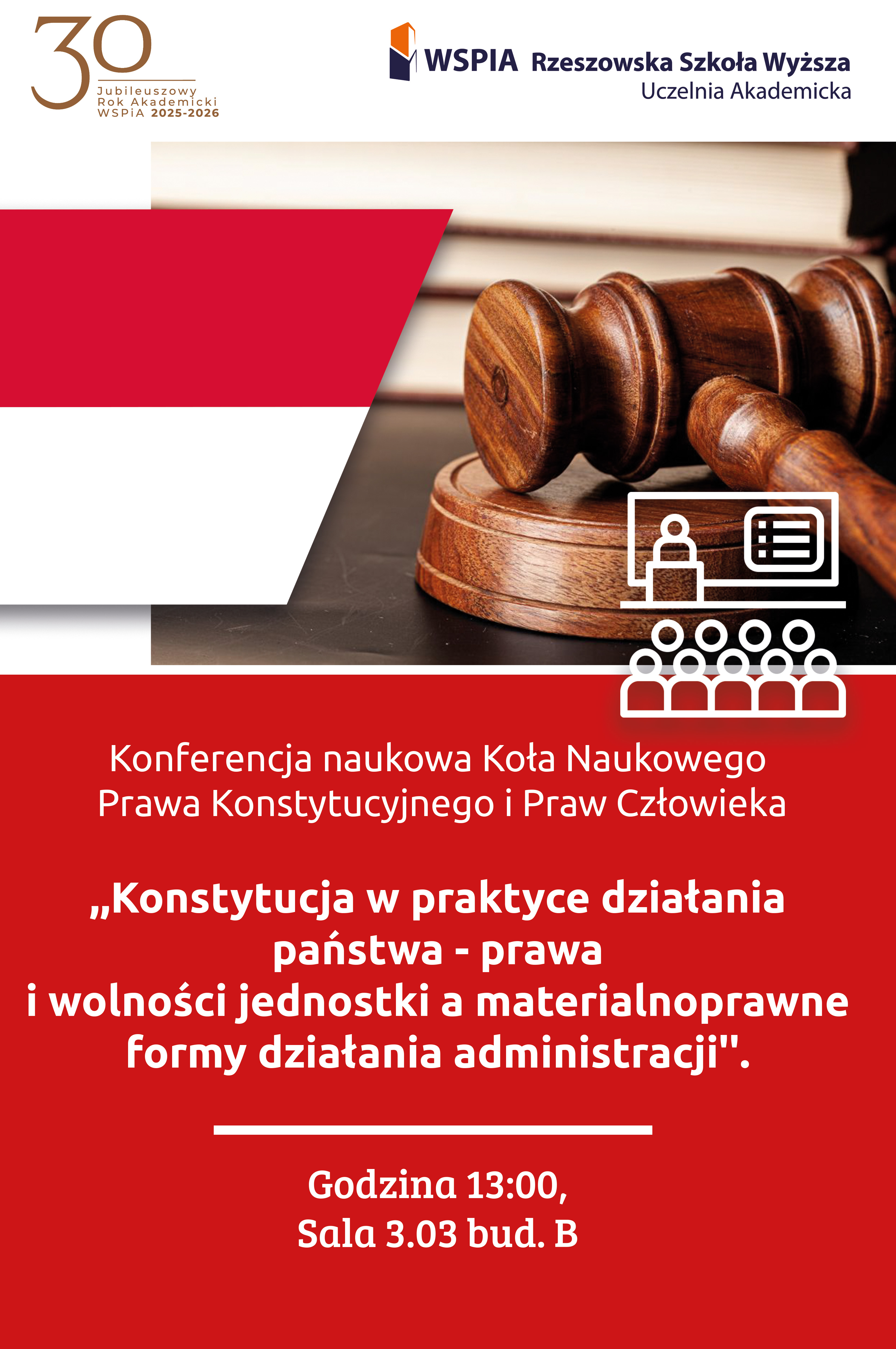 - 13:00 - Konferencja Naukowa "Konstytucja w praktyce działania państwa - prawa i wolności jednostki a materialnoprawne formy działania administracji", organizowana przez Koło Naukowe Konstytucyjne, Sala 3.03, bud. B.